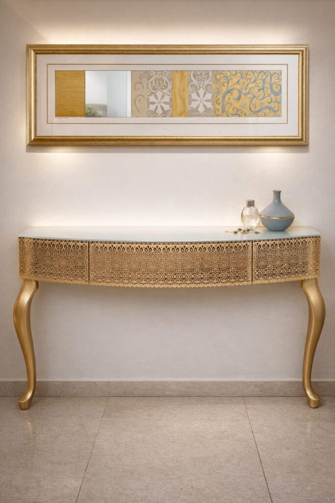 על מנת למקסם את השפעת הרהיט על חלל המגורים, אנו מצרפים לכל קונסולה ציור תואם ומראה המעוצבים באותו ליין של עיצוב.